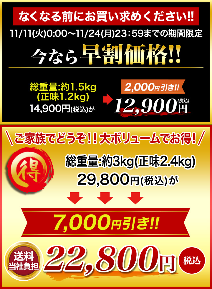 | セット内容 | 【爪剥き身】 総重量:約1.5kg(正味1.2kg)/約25~45本前後 総重量:約3kg(正味2.4kg)/約50~90本前後 ※重量でのお届けとなる為、本数は前後いたします。 |
