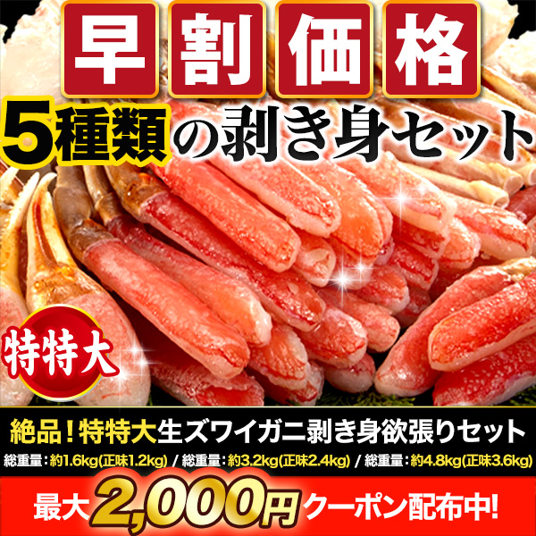 | 商品説明 | 甘さは格別!特特大サイズのボイルズワイガニが豪華5種盛りの大満足セット! お刺身用生ズワイガニの美味しいところを食べつくして下さい! お刺身用ならではのとろける食感とカニ本来の甘さが味わえます。 ポン酢・カニ酢などにつけてそのまま召し上がっても良し、 カニしゃぶや雑炊にもオールマイティーに使えます! カニの殻剥きが面倒という方にオススメ! 解凍してそのままお刺身として食べる事ができます。 ボイルのカニでは味わえないトロンとした甘いカニ肉を存分にお楽しみください! |