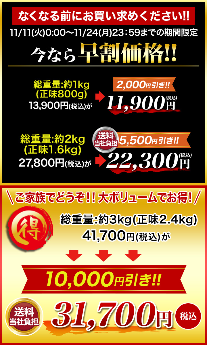 | 送料 | 総重量:約1kg 【全国(右記以外)】1,200円(税込) 【北海道・沖縄・離島】1,750円(税込) 総重量:約2kg/総重量:約3kg 【全国(右記以外)】送料当社負担 【北海道・沖縄・離島】660円(税込) |