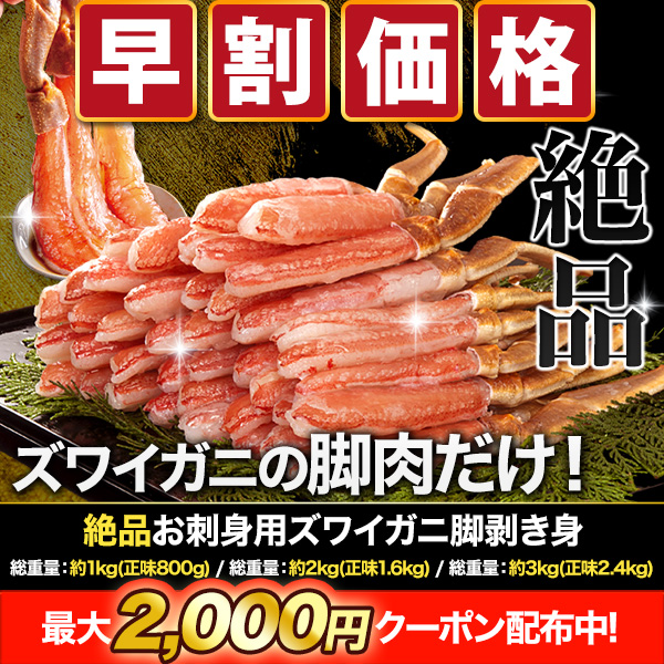 | 商品説明 | 高級料亭の味わいをご自宅で!プリップリのお刺身用の生ズワイガニ! ボイルとはひと味違うカニ刺しの魅力! 国際規格の品質管理手法「HACCP」認定工場で加工。 抜群の鮮度と加工技術で旨味と甘味が凝縮されている 生ズワイガニの脚の剥き身です。 一番食べごたえのある脚肉だけの贅沢なセット! 南蛮なしでこの重量!可食部が多くてお得です! お刺身用ならではのとろける食感とカニ本来の甘さをご堪能下さい! |