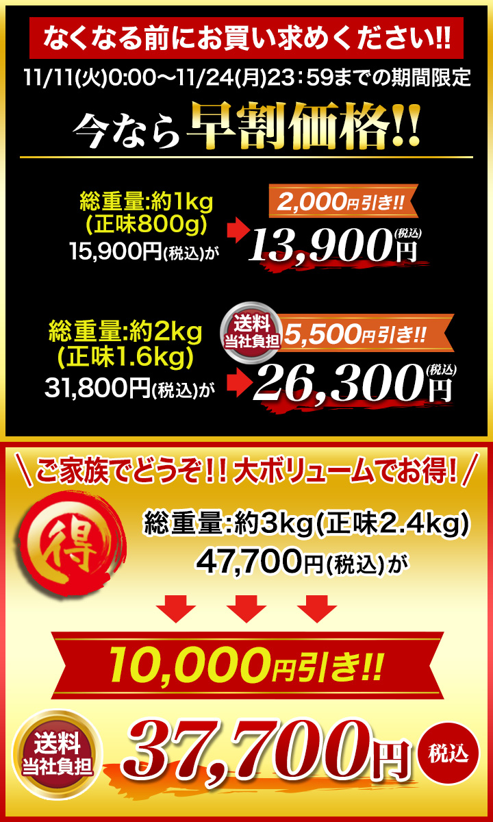 | 送料 | 総重量:約1kg 【全国(右記以外)】1,200円(税込) 【北海道・沖縄・離島】1,750円(税込) 総重量:約2kg/総重量:約3kg 【全国(右記以外)】送料当社負担 【北海道・沖縄・離島】660円(税込) |