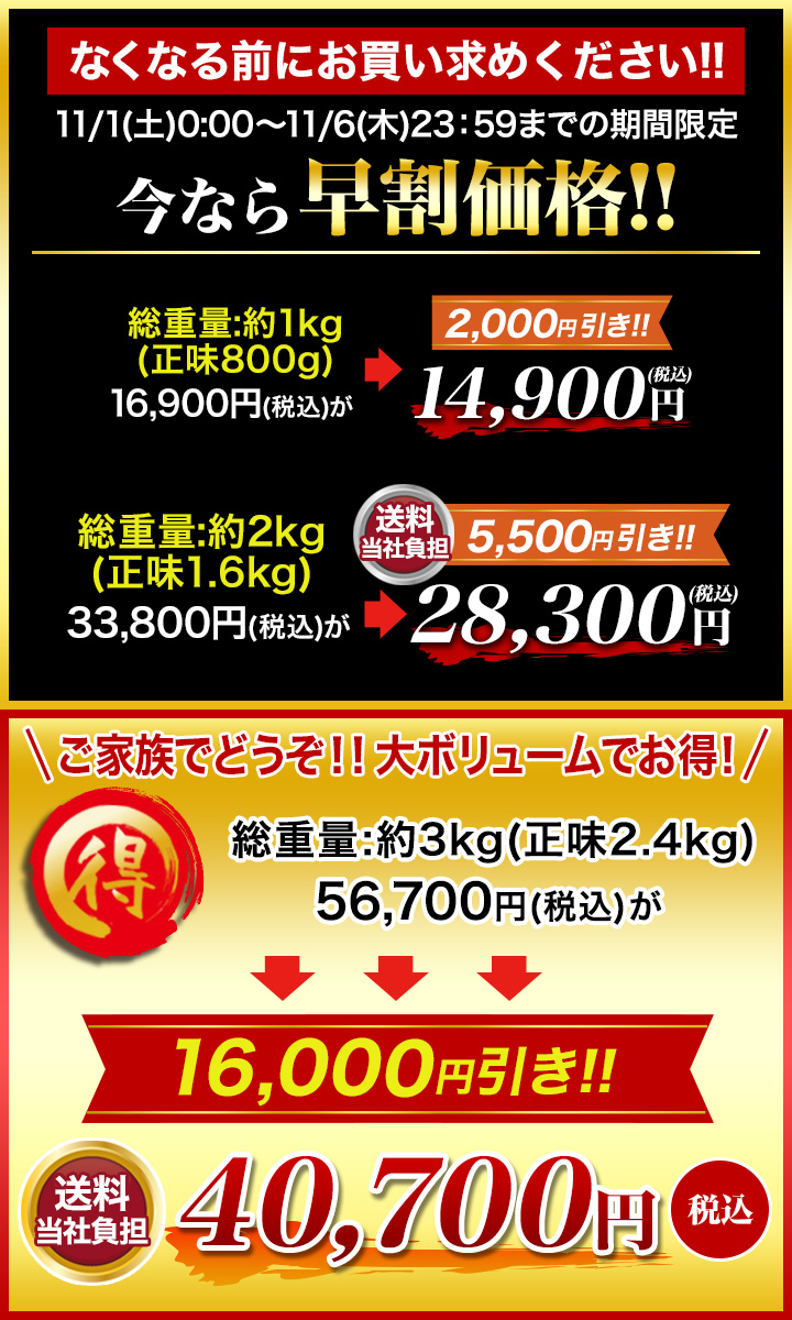 | 送料 | 総重量:約1kg(正味800g) 【全国(右記以外)】1,200円(税込) 【北海道・沖縄・離島】1,750円(税込) 総重量:約2kg(正味1.6kg)/総重量:約3kg(正味2.4kg) 【全国(右記以外)】送料当社負担 【北海道・沖縄・離島】660円(税込) |