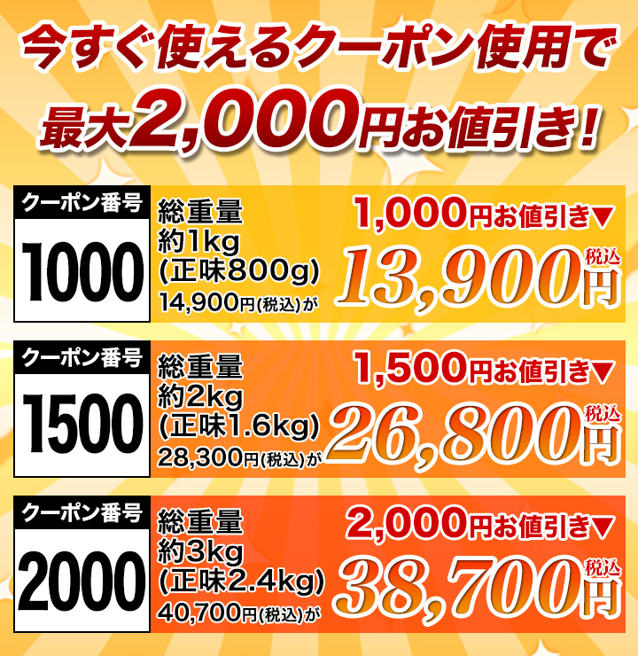 | 商品番号 | 【総重量:約1kg】13307 【総重量:約2kg】13308 【総重量:約3kg】13309 |