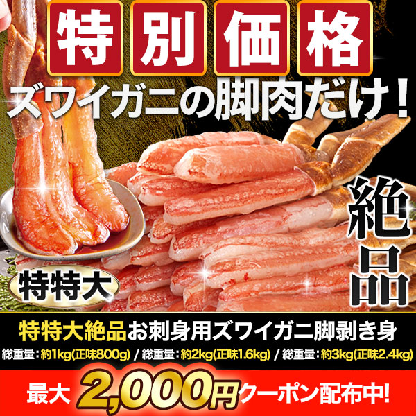 | 商品説明 | 驚きの大きさ!特特大サイズのズワイガニ! 高級料亭の味わいをご自宅で!プリップリのお刺身用の生ズワイガニ! ボイルとはひと味違うカニ刺しの魅力! 国際規格の品質管理手法「HACCP」認定工場で加工。 抜群の鮮度と加工技術で旨味と甘味が凝縮されている 生ズワイガニの脚の剥き身です。 一番食べごたえのある脚肉だけの贅沢なセット! 南蛮なしでこの重量!可食部が多くてお得です! お刺身用ならではのとろける食感とカニ本来の甘さをご堪能下さい! |