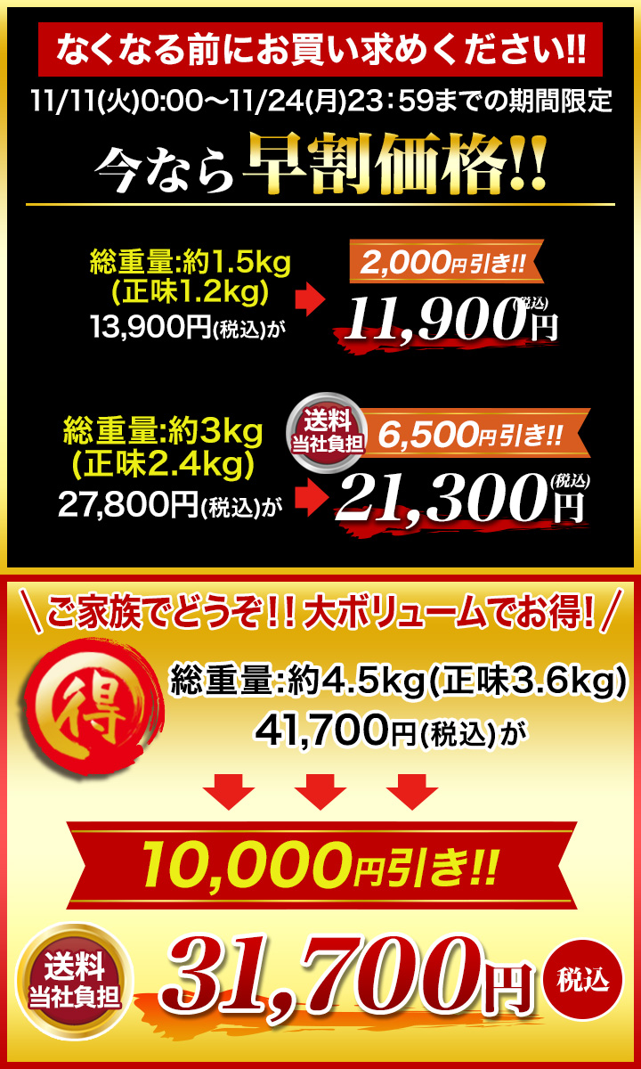 | セット内容 | 総重量:約1.5kg(正味1.2kg) 【南蛮付ハーフポーション(帽子無)】約11~15本前後 【爪ポーション】約4~6本前後 【爪下ポーション】約4~6本前後 【小脚削ぎ】約4~6本前後 【肩肉ハーフカット】約8~12枚前後 総重量:約3kg(正味2.4kg) 【南蛮付ハーフポーション(帽子無)】約22~30本前後 【爪ポーション】約8~12本前後 【爪下ポーション】約8~12本前後 【小脚削ぎ】約8~12本前後 【肩肉ハーフカット】約16~24枚前後 総重量:約4.5kg(正味3.6kg) 【南蛮付ハーフポーション(帽子無)】約33~45本前後 【爪ポーション】約12~18本前後 【爪下ポーション】約12~18本前後 【小脚削ぎ】約12~18本前後 【肩肉ハーフカット】約24~36枚前後 ※重量でのお届けとなる為、爪の数や脚の数は目安となります。 |