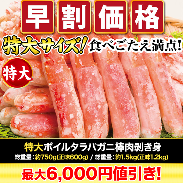 【早割価格】特大ボイルタラバガニ棒肉剥き身 総重量:約750g(正味600g)/総重量:約1.5kg(正味1.2kg)