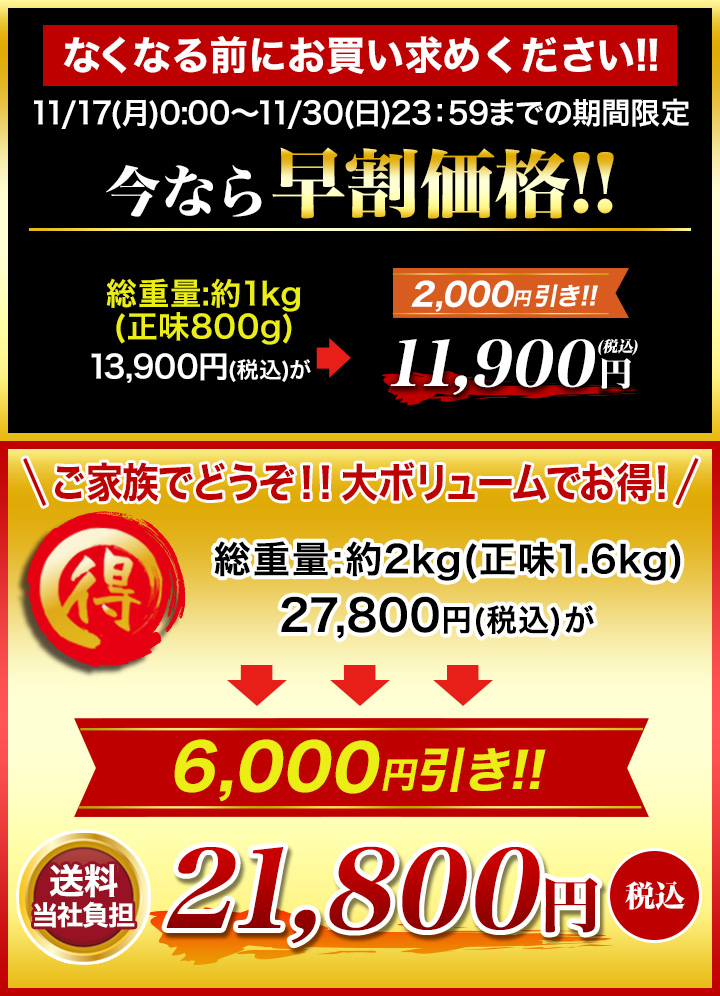 | セット内容 | 総重量:約1kg(正味800g) 【棒肉/ハーフポーション】約3~5本前後 【爪・爪下/センターカット】約2~3本前後 【肩肉/センターカット】約2~3枚前後 【南蛮/ハーフポーション】約3~5本前後 総重量:約2g(正味1.6kg) 【棒肉/ハーフポーション】約6~10本前後 【爪・爪下/センターカット】約4~6本前後 【肩肉/センターカット】約4~6枚前後 【南蛮/ハーフポーション】約6~10本前後 ※1肩サイズ:約700g~900g ※重量でのお届けとなる為、本数、枚数は前後いたします。 |