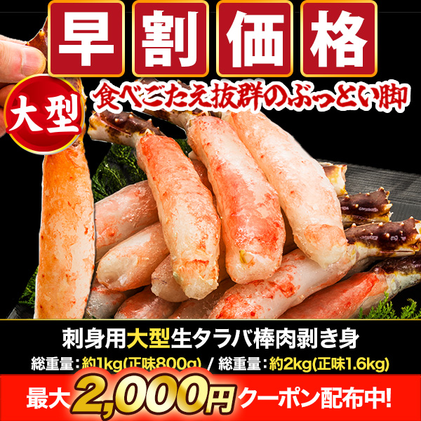 | 商品説明 | 目を見張るほどの分厚いサイズと弾力のあるプリップリの身が自慢のタラバを「生」でご用意しました。 新鮮だから旨味が違う!生だから甘みが違う! 召し上がり方は自由自在。鮮度と品質に自信がある生タラバです。新鮮だからお刺身でもOK! |