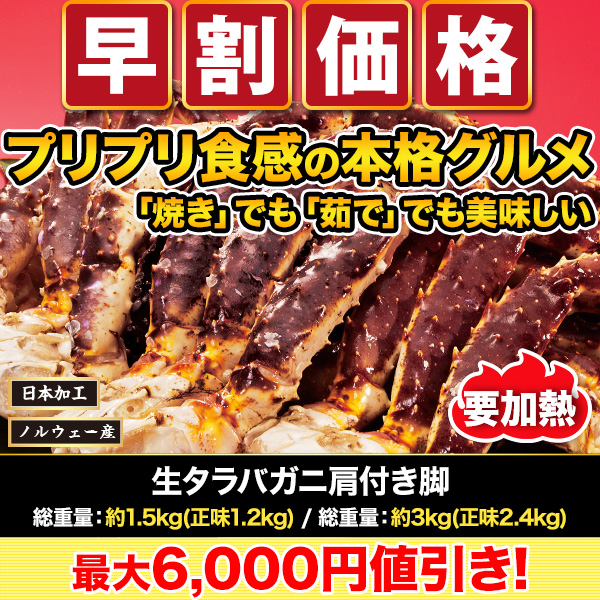 | 商品説明 | 通は「生」!生ならではの感動の甘さ! 「カニの王様」と言われるタラバガニの極太の脚肉!生のままで急速冷凍した新鮮なタラバガニ肩付き脚! 召し上がり方は自由自在。鮮度と品質に自信がある生タラバです。 殻ごと豪快に炙れば、香ばしい焼きガニの完成。家族全員でご堪能ください。 |