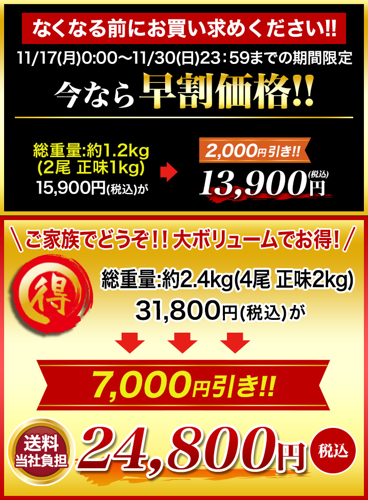 | 商品番号 | 【総重量:約1.2kg(2尾正味1kg)】13370 【総重量:約2.4kg(4尾正味2kg)】13371 |