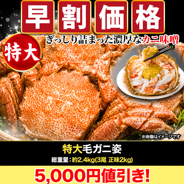 【早割価格】特大毛ガニ姿 総重量:約2.4kg(3尾正味2kg)