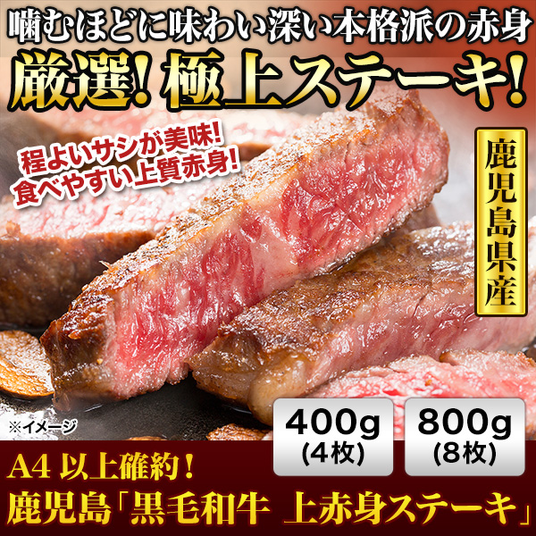 A4以上確約!鹿児島「黒毛和牛 上赤身ステーキ」 400g(4枚)/800g(8枚)