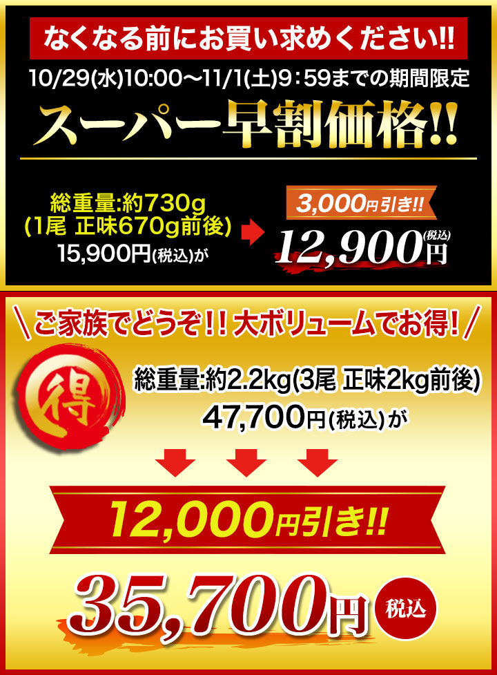 | セット内容 | 1尾あたり:約630g~750g前後 総重量:約730g(1尾 正味670g前後) 総重量:約2.2kg(3尾 正味2kg前後) |