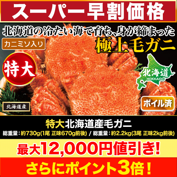 | 商品説明 | 北海道の冷たい海で育ち、身が締まった旨味抜群の極上毛ガニ! ぎっしり身が詰まり、たっぷりの味噌が入った最高級品で身が詰まって旨み抜群です! 北海道で水揚げされた毛ガニは3~5月に旬の時期を迎え、ぎっしり身が詰まり、たっぷりの味噌が入った最高級品です。 |