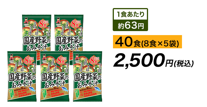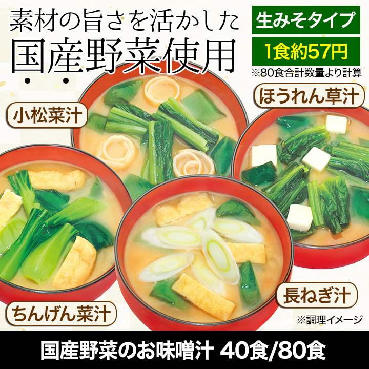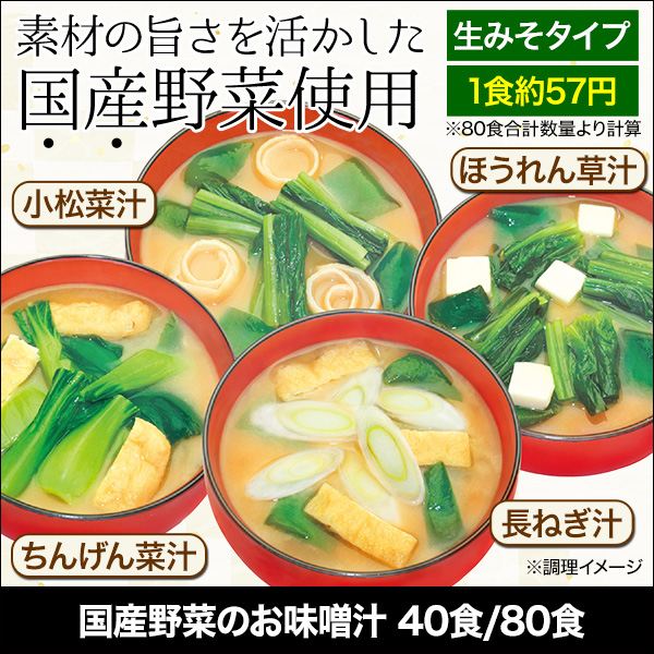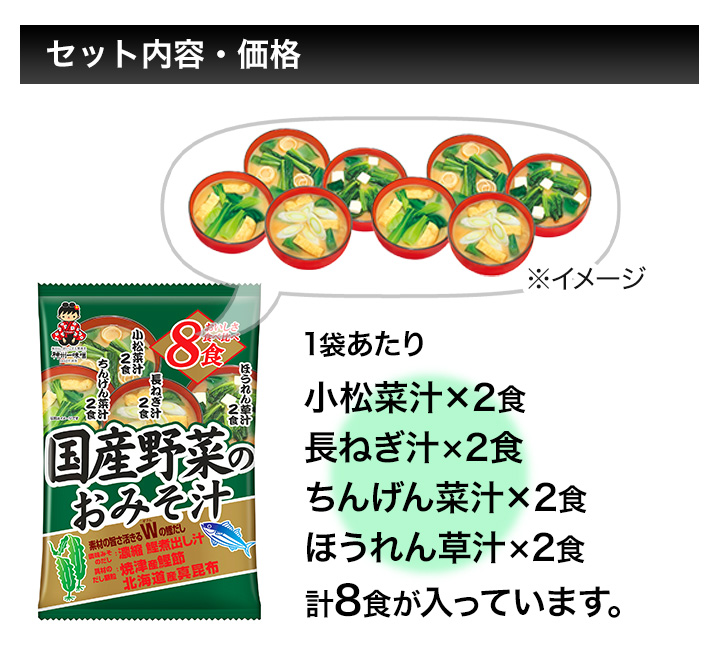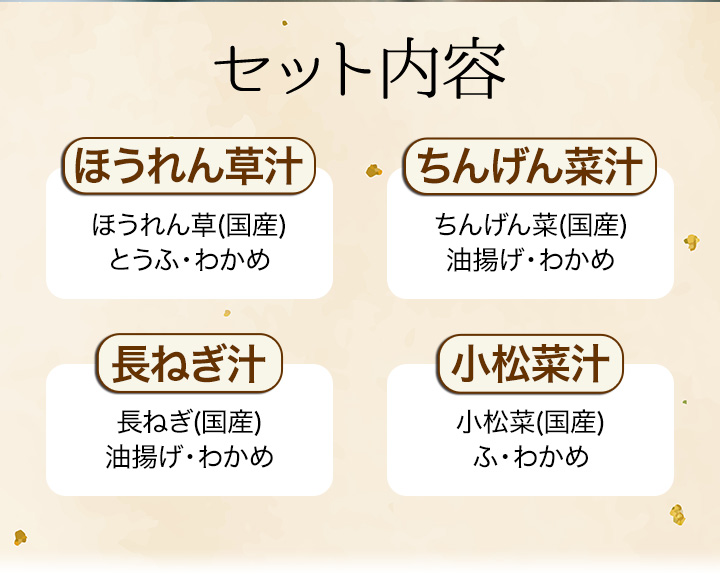 【小松菜汁の具】小松菜、ふ、わかめ、だし顆粒(食塩、ぶどう糖、宗田かつお節粉末、デキストリン)/調味料(アミノ酸等)、酸化防止剤(ビタミンE)、クエン酸、(一部に小麦・乳成分を含む)