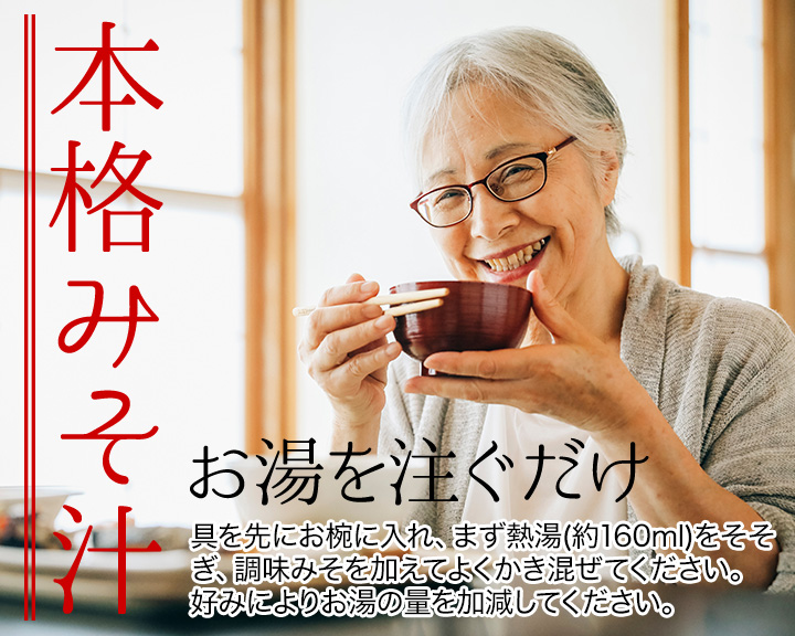 お召し上がり方 具を先にお椀に入れ、まず熱湯(約160ml)をそそぎ、調味みそを加えてよくかき混ぜてください。好みによりお湯の量を加減してください。