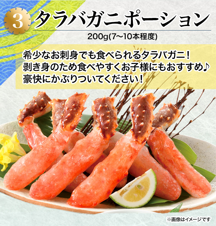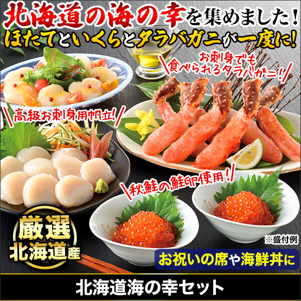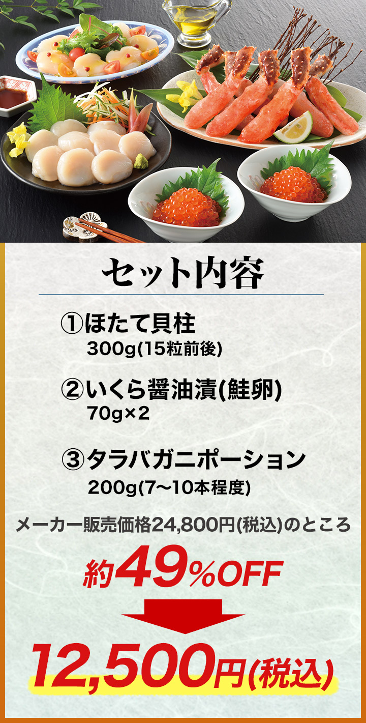 | 内容量 | ほたて貝柱:300g(15粒前後) いくら醬油漬(鮭卵):70g×2 タラバガニポーション:200g(7~10本程度) |