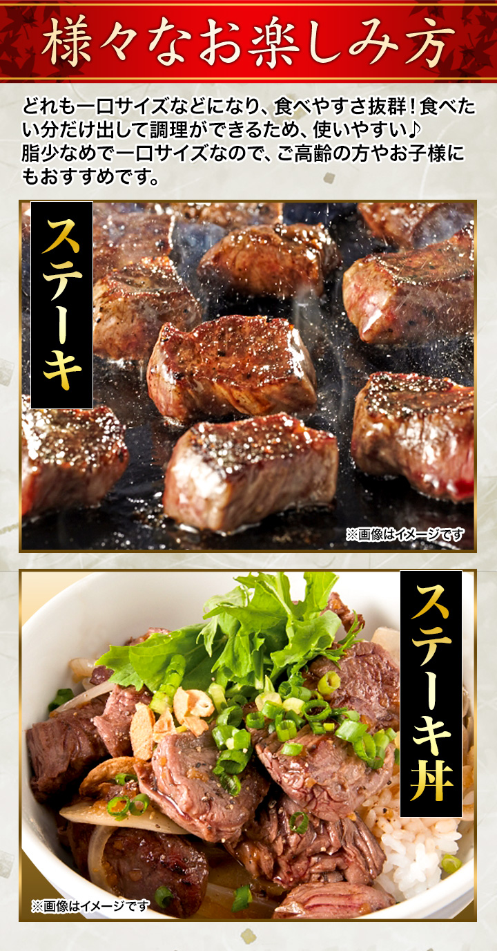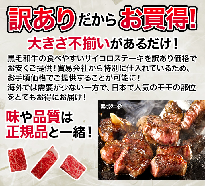 | 商品説明 | 黒毛和牛の食べやすいサイコロステーキを訳あり価格でお安くご提供! 大きさ不揃いがあるだけで、味や品質は正規品と変わりません。 脂少なめさっぱりのモモ肉を一口サイズで!ご高齢者やお子様にもおすすめです。 |