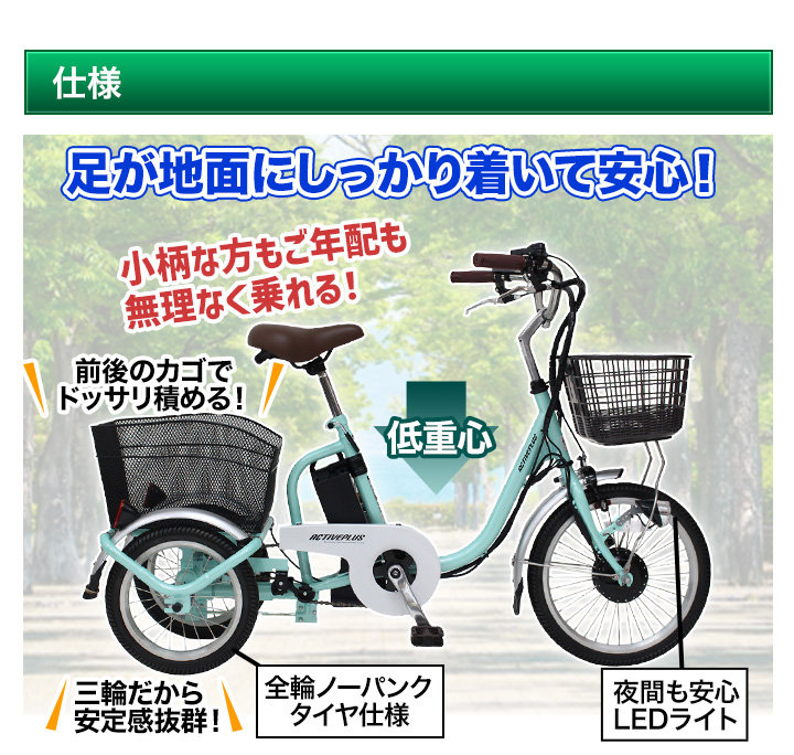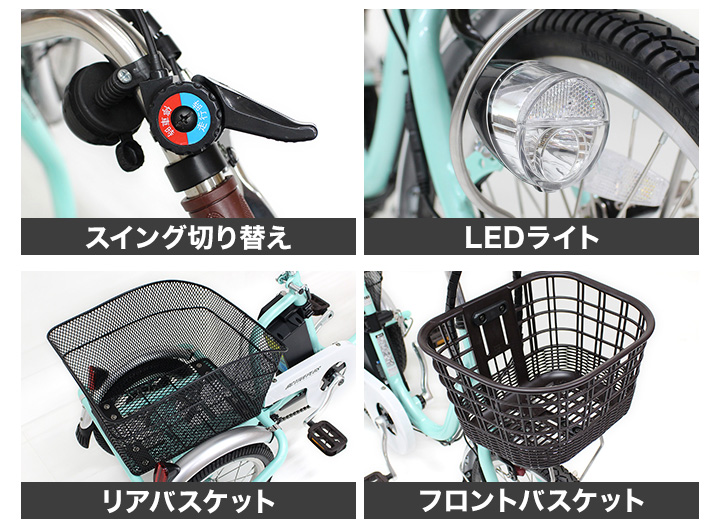 【仕様】 アシスト機能・ノーパンクタイヤ・シングルギア・スイング機能・ワンタッチコントローラー・LEDライト・前カゴ(樹脂製大型)・後カゴ(メッシュ)・前輪錠(スペアキー付)