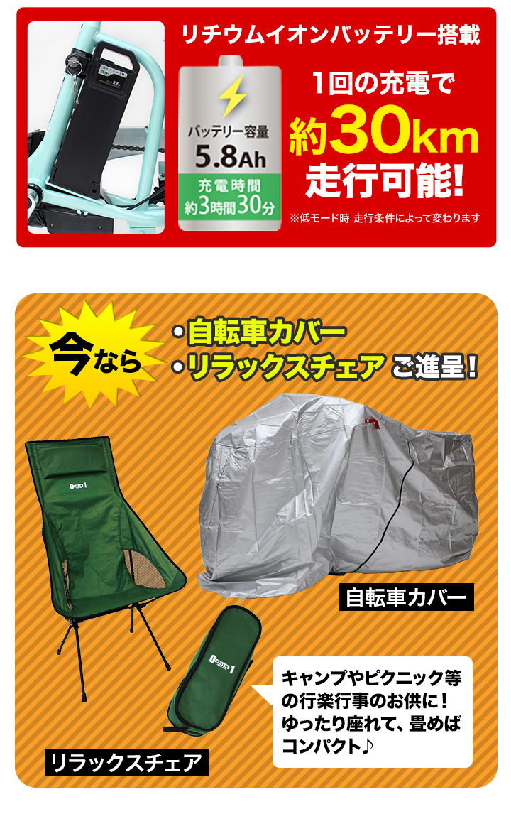 ご購入から1年間のメーカー保証付き。今なら自転車カバーとリラックスチェアをご進呈♪