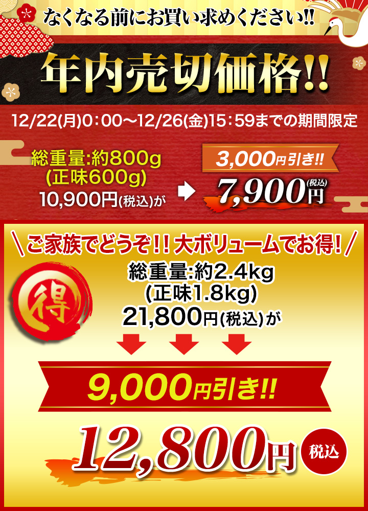 | セット内容 | 総重量:約800g(正味600g) 【南蛮付棒肉(帽子無)/ハーフポーション】約5~7本前後 【二本爪/フルポーション】約2~3本前後 【爪下/ハーフポーション】約2~3本前後 【小脚削ぎ】約2~3本前後 【肩肉/ハーフカット】約4~6枚前後 総重量:約2.4kg(1.6kg+800g)(正味1.8kg) 【南蛮付棒肉(帽子無)/ハーフポーション】約15~21本前後 【二本爪/フルポーション】約6~9本前後 【爪下/ハーフポーション】約6~9本前後 【小脚削ぎ】約6~9本前後 【肩肉/ハーフカット】約12~18枚前後 ※重量でのお届けとなる為、爪の数や脚の数は目安となります。 |