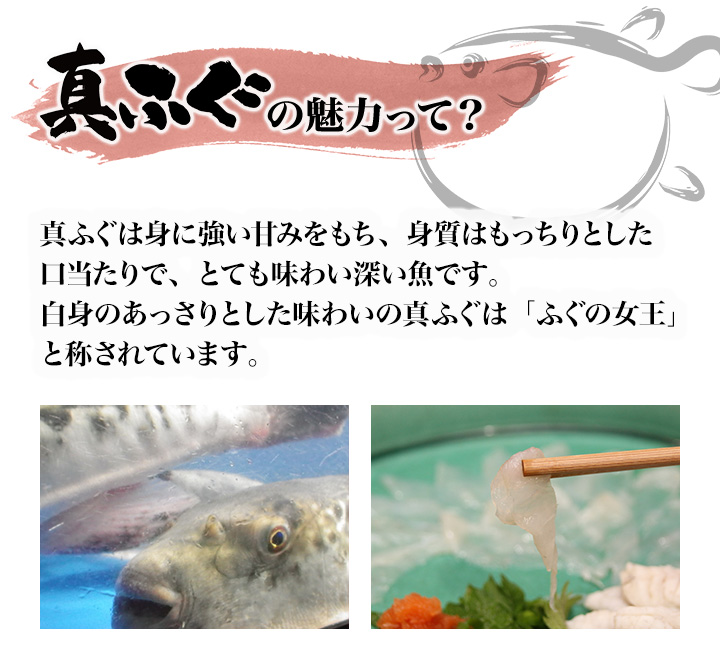 | 商品説明 | ふぐの本場「下関」より直送!! 国産天然真ふぐのスぺシャルセット! 「ふぐの女王」と呼ばれる真ふぐは、鍋にするとプリップリの食感と旨味が増します。 てっさも楽しめて、ご満足いただける鍋セットです。 ちりの後は、ふぐの旨味が凝縮されただしでつくる、仕上げの雑炊までたっぷりとご堪能いただけます。 |