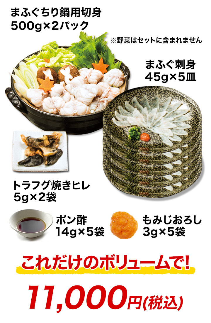 | セット内容 | まふぐ刺身(45g)×5皿、まふぐちり鍋用切身(500g)×2パック、ポン酢(14g)×5袋、もみじおろし(3g)×5袋、トラフグ焼きヒレ(5g)×2袋 ※鍋スープは付属していません |
