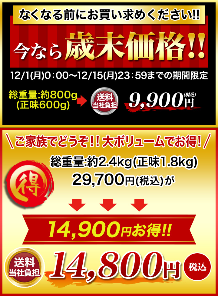 | セット内容 | 総重量:約800g(正味600g) 【南蛮付棒肉(帽子無)/ハーフポーション】約5~7本前後 【二本爪/フルポーション】約2~3本前後 【爪下/ハーフポーション】約2~3本前後 【小脚削ぎ】約2~3本前後 【肩肉/ハーフカット】約4~6枚前後 総重量:約2.4kg(1.6kg+800g)(正味1.8kg) 【南蛮付棒肉(帽子無)/ハーフポーション】約15~21本前後 【二本爪/フルポーション】約6~9本前後 【爪下/ハーフポーション】約6~9本前後 【小脚削ぎ】約6~9本前後 【肩肉/ハーフカット】約12~18枚前後 ※重量でのお届けとなる為、爪の数や脚の数は目安となります。 |