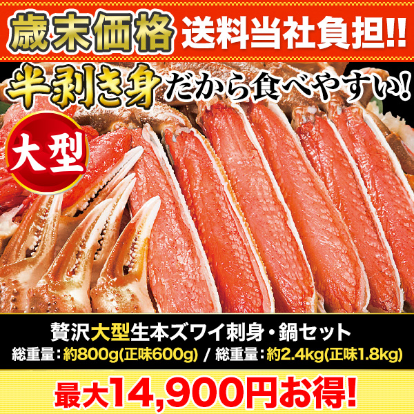 | 備考 | 総重量とは、グレーズ(氷)を含む重量です。 グレーズとは、空気に触れることによる乾燥や酸化を防ぐための氷の被膜です。 ( )内の正味とは、グレーズを除いたカニのみの重量です。 商品のラベルにはカニ正味の重量を記載しています。 折れを含みます。 |