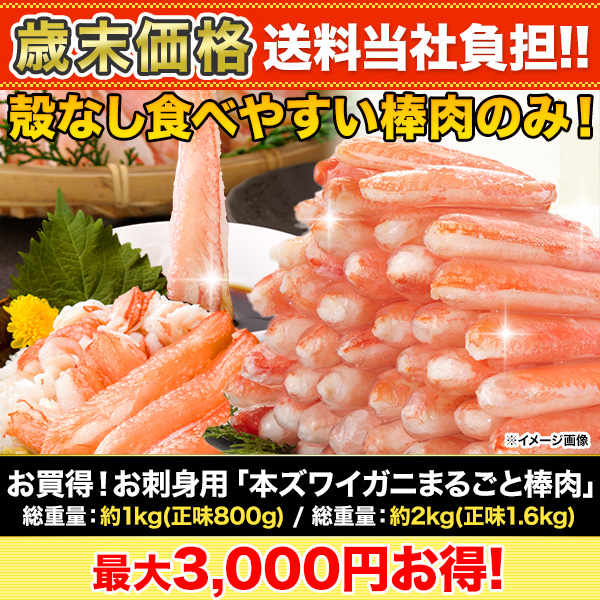 | 商品説明 | 可食部ほぼ100%!重たい肩肉や殻を含まず、 棒肉のお刺身のみをお届けします! お刺身用ならではのとろける食感とカニ本来の甘さが味わえます。 ポン酢・カニ酢などにつけてそのまま召し上がっても良し、 カニしゃぶや雑炊にもオールマイティーに使えます! カニの一番いいところを食べやすく殻剥きしていますので、 解凍してそのままお刺身として食べる事ができます。 ボイルのカニでは味わえないトロンとした甘いカニ肉を存分にお楽しみください! |