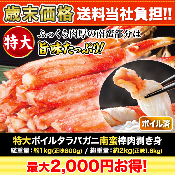 | 商品説明 | 思わず笑みがこぼれるほどの驚きの大きさ! 溢れる甘みと食感が魅力のカニの王様、 ボイルタラバガニの南蛮剥き身・特大サイズ! 繊維がしっかりした身には旨味たっぷり! タラバガニだけど南蛮部分だからお買い得!南蛮とはカニ脚の先端部分です。 繊細で奥深い上品な味わいの部位です。 ボイル済みで剥き身なので、解凍後そのままかぶりついても良し! 殻を剥く手間が無く、後片付けも簡単! カニ雑炊、カニ炒飯、カニフライ、カニソテー、カニちらし寿司、 カニ蟹グラタン、カニ玉スープと、タラバガニ南蛮剥き身は料理の腕の見せ所♪ |