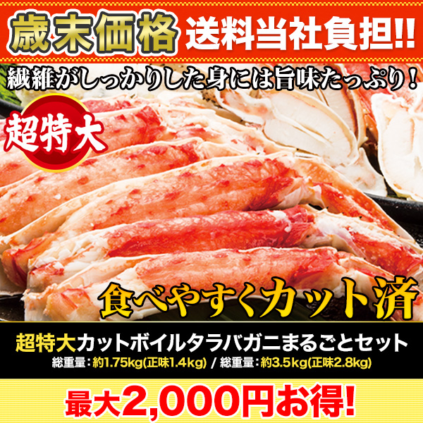 | 商品説明 | 驚きの大きさ!超特大サイズのボイルタラバガニ! ぶっとい身にガブっとかぶりつく、タラバの醍醐味を手軽に、思いっきり! 大人気のタラバガニが最初からカットしてあるので、 殻剥きが簡単なセットです。 硬いトゲトゲとした殻は剥くのが大変ですが、このセットなら、脚・爪・肩の美味しいところをカットして、4つの部位の盛り合わせでお届けします。 しかもボイルしてあるので、解凍後そのままお召し上がりいただけます。 水揚げした後、急速冷凍しているので鮮度も抜群! 獲れたての旨みがギュッと詰まっています。 爪も食べやすく縦半分にカットしてあるので、クルンと取り出してパクっ!弾力がすごくて甘みも濃いです。 完全な剥き身ではなく、殻が半分付いているので、焼きガニもおすすめ。 タラバガニの濃厚な旨味とボリューム感をご堪能ください! |