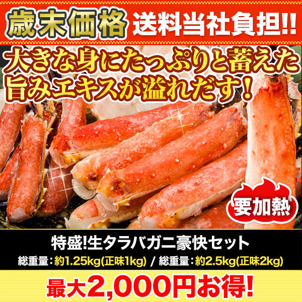【歳末価格+送料当社負担】特盛!生タラバガニ豪快セット 総重量:約1.25kg(正味1kg)/総重量:約2.5kg(正味2kg)