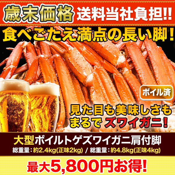 | 商品説明 | 大型サイズの希少価値が高いカニ! 「見た目も美味しさもまるでズワイガニ」でおなじみのトゲズワイガニ。 トゲズワイガニは、フワっと繊細で柔らかな食感の本ズワイの濃厚な旨みと、 紅ズワイの瑞々しい甘さが合わさったような、良いとこどりの美味しさ! 食べやすくて、身の部分がたっぷりの肩付き脚でお届けします! 解凍して、お好みで塩抜きをしたら、殻からするするっと長い脚の身を 取り出して、思いっきりかぶりついてください。 お口いっぱいにじゅわじゅわと広がるカニの甘みを堪能してください。 そのまま何もつけなくても美味しいですが、 カニ酢やわさび醤油、ポン酢、マヨネーズなど、 いろいろ用意して味の変化を楽しみながらお召し上がりください。 |