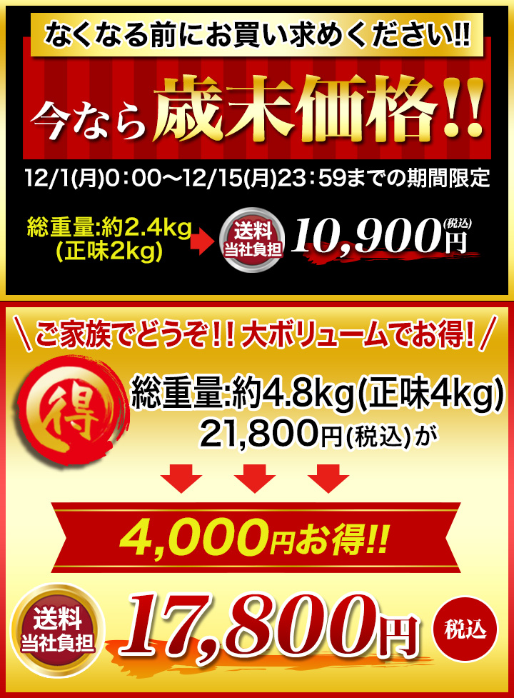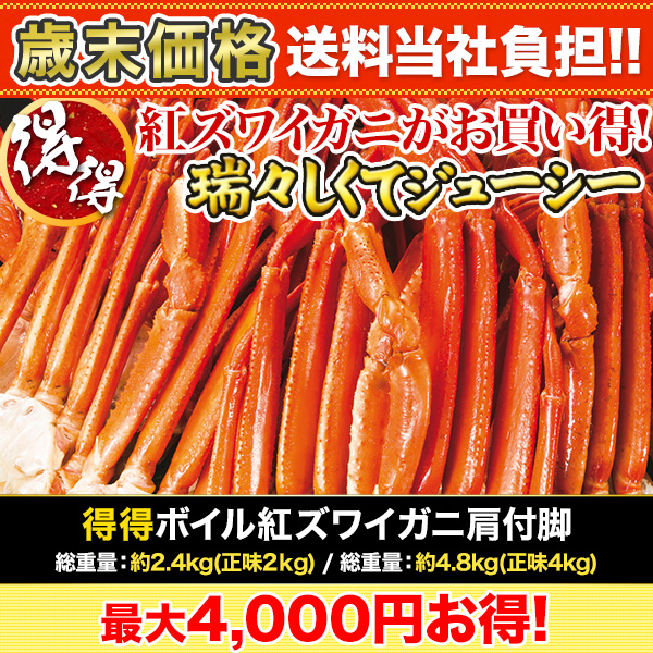 【歳末価格+送料当社負担】得得ボイル紅ズワイガニ肩付脚 総重量:約2.4kg(正味2kg)/総重量:約4.8kg(正味4kg)