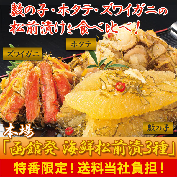| 商品説明 | 本場の豪華松前漬を北海道・函館からお届け! 一本羽を使い、コリコリ・ポリポリとした歯ごたえを楽しめる「数の子松前漬」、身がギュッと締まったズワイガニを厳選した「ズワイガニ入松前漬」、弾けそうなほどプリプリのホタテが入った「ホタテ入松前漬」を食べ比べてください! お酒の肴や、白いご飯のおともにピッタリです! |