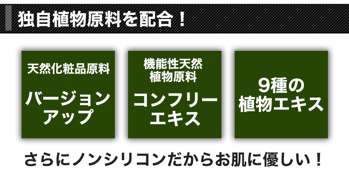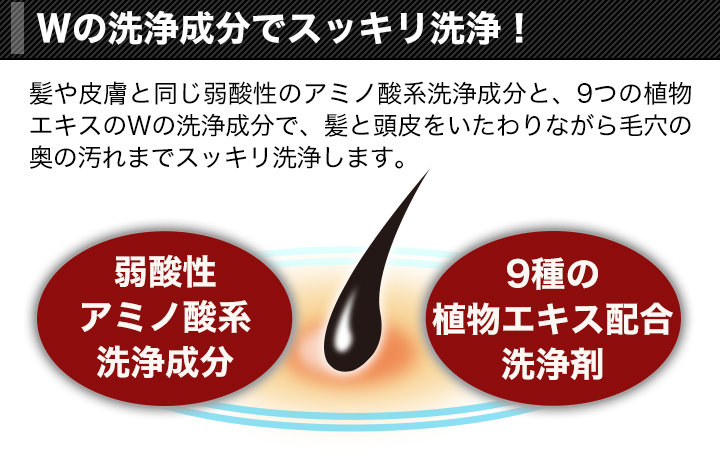 | 成分 | 水、ココイルアラニンTEA、ココイルグルタミン酸TEA、コカミドDEA、ラウリルヒドロキシスルタイン、 セテアレス-60ミリスチルグリコール、ポリクオタニウム-10、ラウリン酸PEG-80ソルビタン、ステアラミドプロピルジメチルアミン、ポリソルベート-80、アルギニン、グリセリン、オクチルドデセス-20、水酸化レシチン、 エタノール、スクワラン、BG、オランダガラシ葉/茎エキス、イチョウ葉エキス、コンフリー葉エキス、ゴボウ根エキス、セイヨウアカマツ球果エキス、セイヨウキズタ葉/茎エキス、ニンニク根エキス、ローズマリー葉エキス、ローマカミツレ花エキス、アルニカ花エキス、オドリコソウ花/葉/茎エキス、クエン酸、エチルヘキシルグリセリン、フェノキシエタノール、香料 |