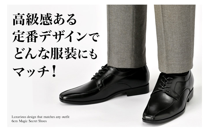 スーツ姿がきまらない時にも、スタイルアップでスラっとした姿に仕上げてくれる、魔法のシークレットシューズです。