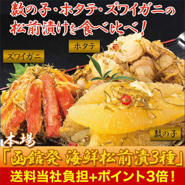3kg:数の子松前漬1kg(500g×2)、ズワイガニ入松前漬1kg(500g×2)、ホタテ入松前漬1kg(500g×2)