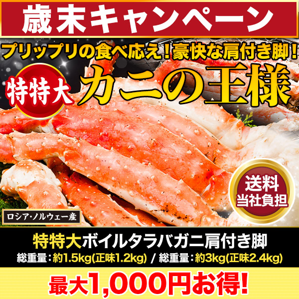 | 商品説明 | 思わず笑みがこぼれるほどの驚きの大きさ!特特大サイズのタラバガニ! 身入りパンパンの特特大ごんぶとの脚! タラバガニの魅力は何といっても濃厚な旨味とボリューム。 はちきれんばかりに身が詰まった極太の脚にガブリとかぶりつけば、 ジューシーな甘みが広がって食べ応え満点です。 漁獲量が激減しているタラバガニのこのサイズは貴重です。 ボイル済みなので、解凍するだけで食べられます。 焼きガニにしても美味しくお召し上がりいただけます。 ブルンブルンの肉厚と食べ応え満点のもっちり食感のカニの王様を、 口いっぱいに頬張る幸せを味わってください。 |