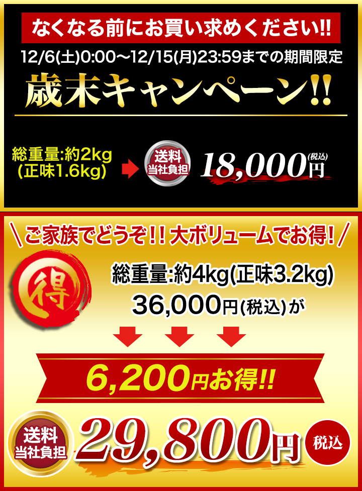 | 備考 | 総重量とは、グレーズ(氷)を含む重量です。 グレーズとは、空気に触れることによる乾燥や酸化を防ぐための氷の被膜です。 ( )内の正味とは、グレーズを除いたカニのみの重量です。 商品のラベルにはカニ正味の重量を記載しています。 |