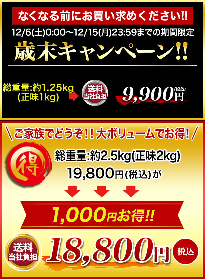 | セット内容 | 総重量:約1.25kg(正味1kg) 【棒肉/ハーフポーション】約5~7本前後 【爪・爪下/センターカット】約4~6本前後 【肩肉/センターカット】約4~6枚前後 【南蛮/ハーフポーション】約5~7本前後 総重量:約2.5kg(正味2kg) 【棒肉/ハーフポーション】約10~18本前後 【爪・爪下/センターカット】約8~16本前後 【肩肉/センターカット】約8~14枚前後 【南蛮/ハーフポーション】約10~18本前後 ※1肩サイズ:約300g~500g前後 ※重量でのお届けとなる為、本数、枚数は前後いたします。 |