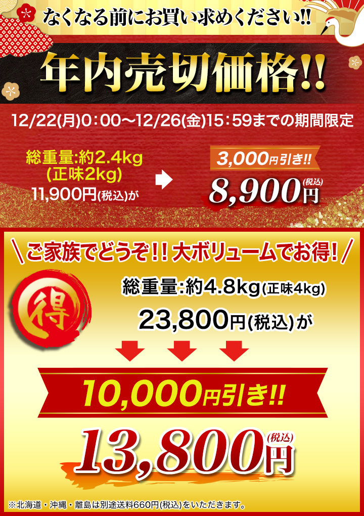 | セット内容 | 1肩サイズ:約100g~150g前後 総重量:約2.4kg(正味2kg)/約13~20肩前後 総重量:約4.8kg(正味4kg)/約27~40肩前後 ※重量でのお届けとなる為、肩数は目安となります。 ※脚を足してくっついているように冷凍しているものもございます。 |