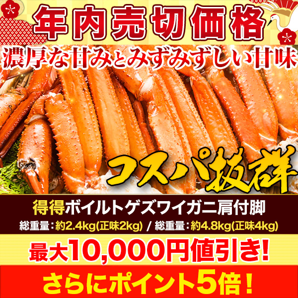 | 商品説明 | 「見た目も美味しさもまるでズワイガニ」でおなじみのトゲズワイガニ! トゲズワイガニは、フワっと繊細で柔らかな食感の本ズワイの濃厚な旨みと、 紅ズワイの瑞々しい甘さが合わさったような、良いとこどりの美味しさ! 食べやすくて、身の部分がたっぷりの肩付き脚でお届けします! 解凍して、お好みで塩抜きをしたら、殻からするするっと長い脚の身を 取り出して、思いっきりかぶりついてください。 お口いっぱいにじゅわじゅわと広がるカニの甘みを堪能してください。 そのまま何もつけなくても美味しいですが、 カニ酢やわさび醤油、ポン酢、マヨネーズなど、 いろいろ用意して味の変化を楽しみながらお召し上がりください。 |