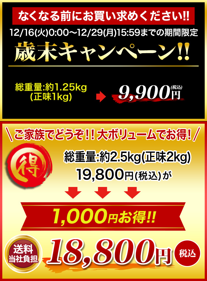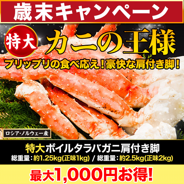 【歳末キャンペーン】特大ボイルタラバガニ肩付き脚 総重量:約1.25kg(正味1kg)/総重量:約2.5kg(正味2kg)