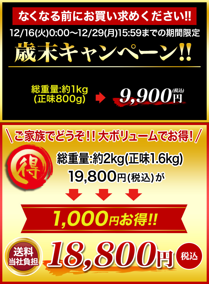 | セット内容 | 総重量:約1kg(正味800g) 【棒肉/ハーフポーション】約3~5本前後 【爪・爪下/センターカット】約2~3本前後 【肩肉/センターカット】約2~3枚前後 【南蛮/ハーフポーション】約3~5本前後 総重量:約2g(正味1.6kg) 【棒肉/ハーフポーション】約6~10本前後 【爪・爪下/センターカット】約4~6本前後 【肩肉/センターカット】約4~6枚前後 【南蛮/ハーフポーション】約6~10本前後 ※1肩サイズ:約700g~900g ※重量でのお届けとなる為、本数、枚数は前後いたします。 |