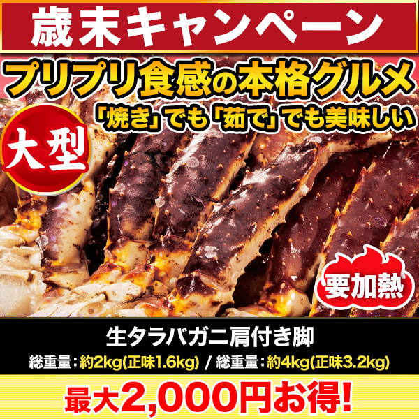 | 商品説明 | 通は「生」!生ならではの感動の甘さ! 「カニの王様」と言われるタラバガニの極太の脚肉!生のままで急速冷凍した新鮮な大型タラバガニ肩付き脚! 召し上がり方は自由自在。鮮度と品質に自信がある生タラバです。 殻ごと豪快に炙れば、香ばしい焼きガニの完成。家族全員でご堪能ください。 |