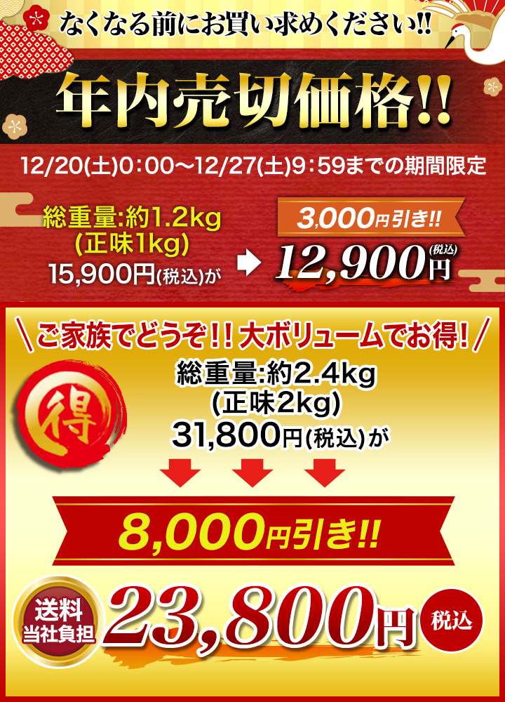 | 商品番号 | 【総重量:約1.2kg(2尾正味1kg)】13927 【総重量:約2.4kg(4尾正味2kg)】13928 |