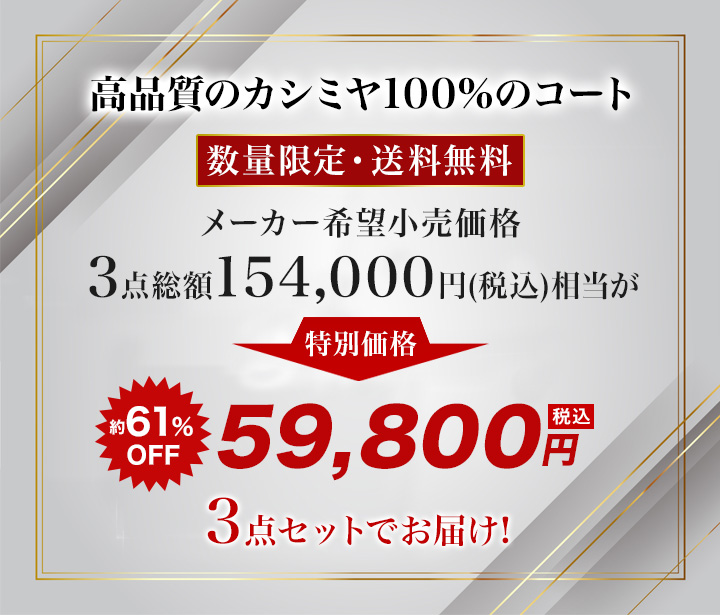 | 商品説明 | 高級カシミヤ100%のコートが驚きの大特価! 毛皮の老舗メーカーからカシミヤ山羊の産毛のみを採取した柔らかで軽く保温性が高い高品質のカシミヤを100%使用した高級感溢れるコートを厳選! どんなファッションにも合わせやすいコート、ベーシックカラーでおしゃれなストール、定番デザインのベルトの3点セットです。 メーカー希望小売価格総額154,000円(税込)相当の3点セットを約61%OFFの大特価でお届けします。 |