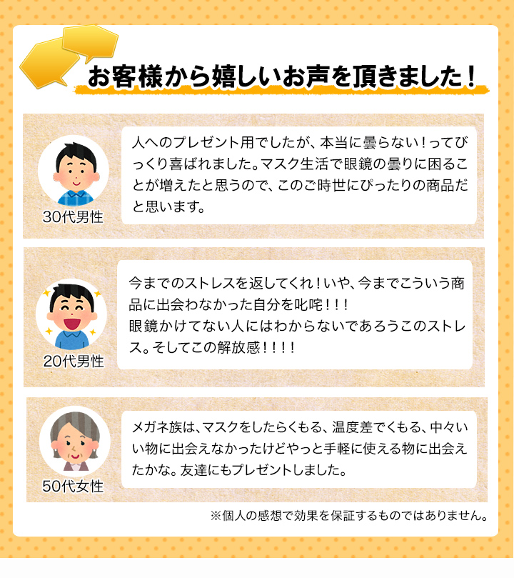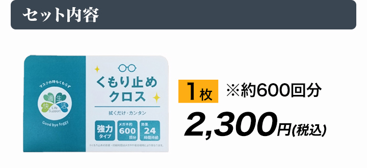 ジェルタイプの曇り止めは「ムラなく伸ばすこと」「乾かす必要がある」「拭き取り用のティッシュを常備する必要がある」などの不便さがあります。そこで、いつもの眼鏡のお手入れの延長で使える「コツ要らず」「処理後すぐに眼鏡をかけられる」クロスタイプの曇り止めを開発。